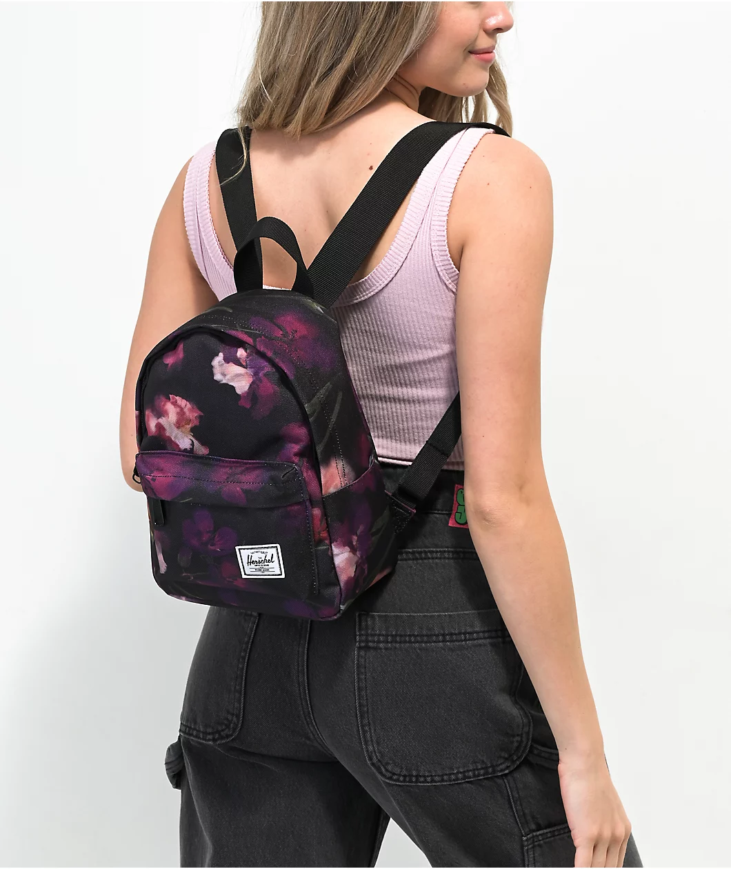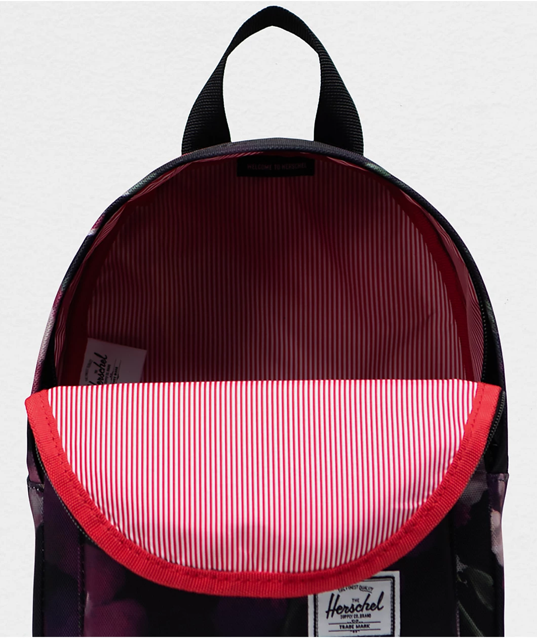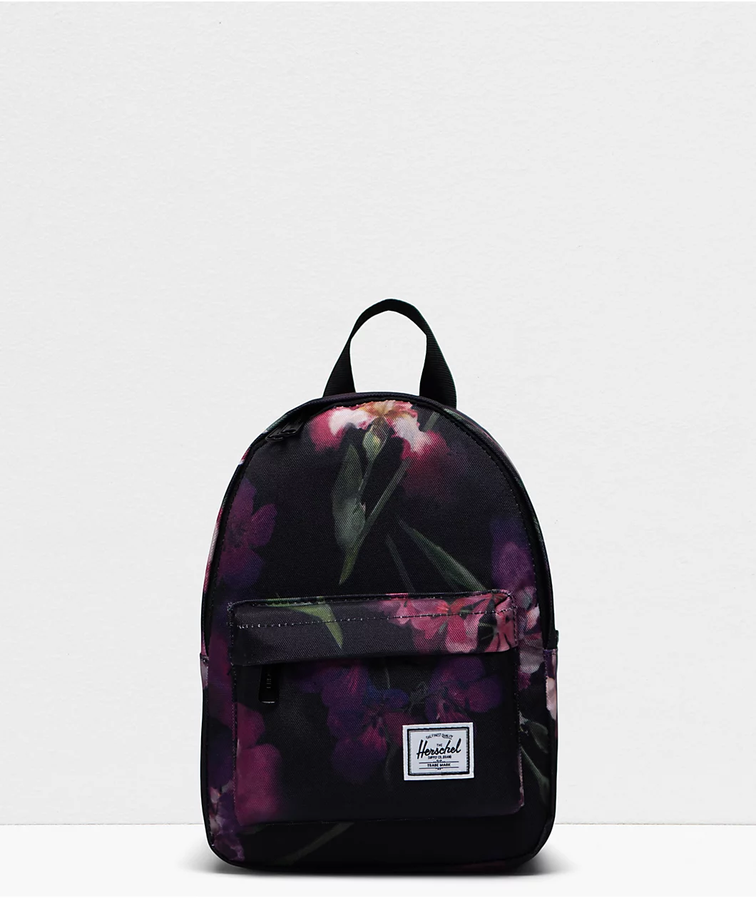 The Classic Iris Watercolor mini backpack from Herschel Supply Co. Classic comes in a black colorway with a watercolored flower pattern throughout. It has a main zippered compartment that is lined with striking red and white pin stripes, and, on the front, a smaller zippered compartment. It has a 9-liter carrying capacity, making it perfect for all your daily essentials without adding too much bulk.
