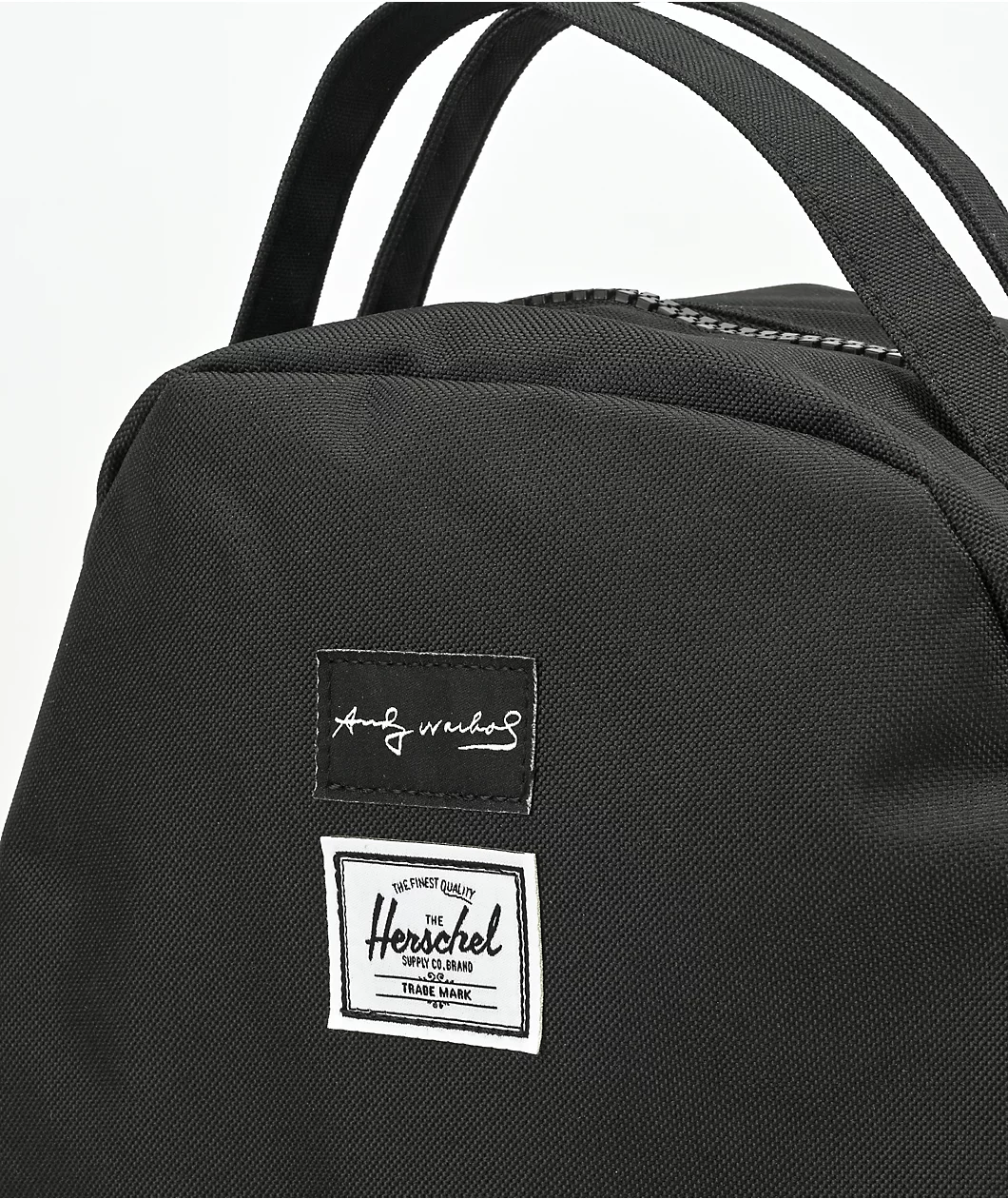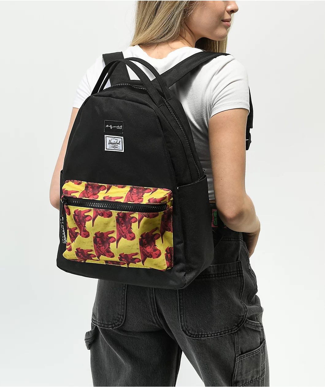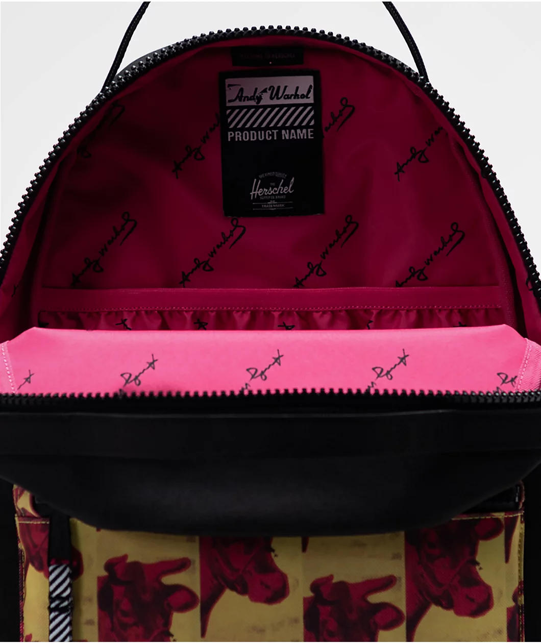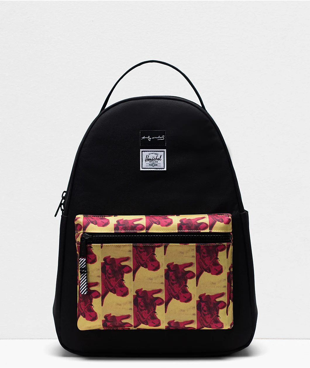 From the great Andy Warhol and Herschel Supply Co. comes the Cows Nova Mid backpack. The bag includes a large main zippered compartment with an internal 13″ laptop sleeve, a smaller pouch compartment at the front with zip-closure, a dual haul handle, and lightly padded and adjustable shoulder straps. The Herschel Supply Co. backpack also features a black canvas exterior and graphics of cows at the front pouch inspired by Andy Warhol’s beloved Cow piece.