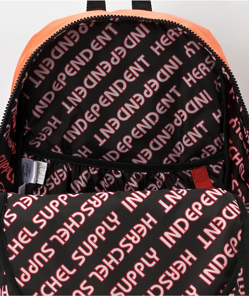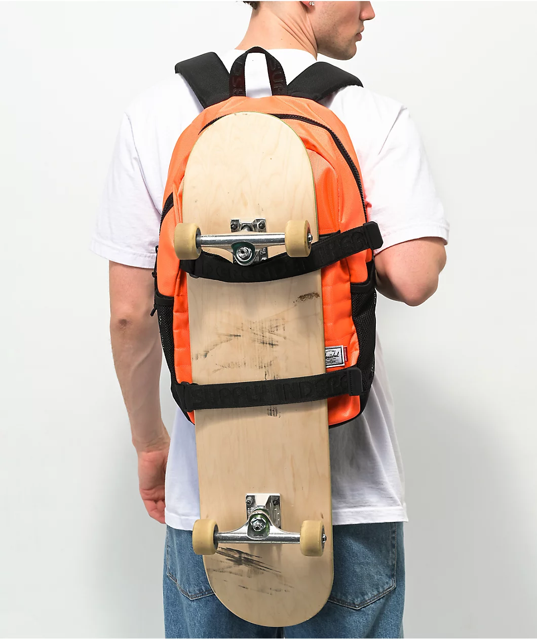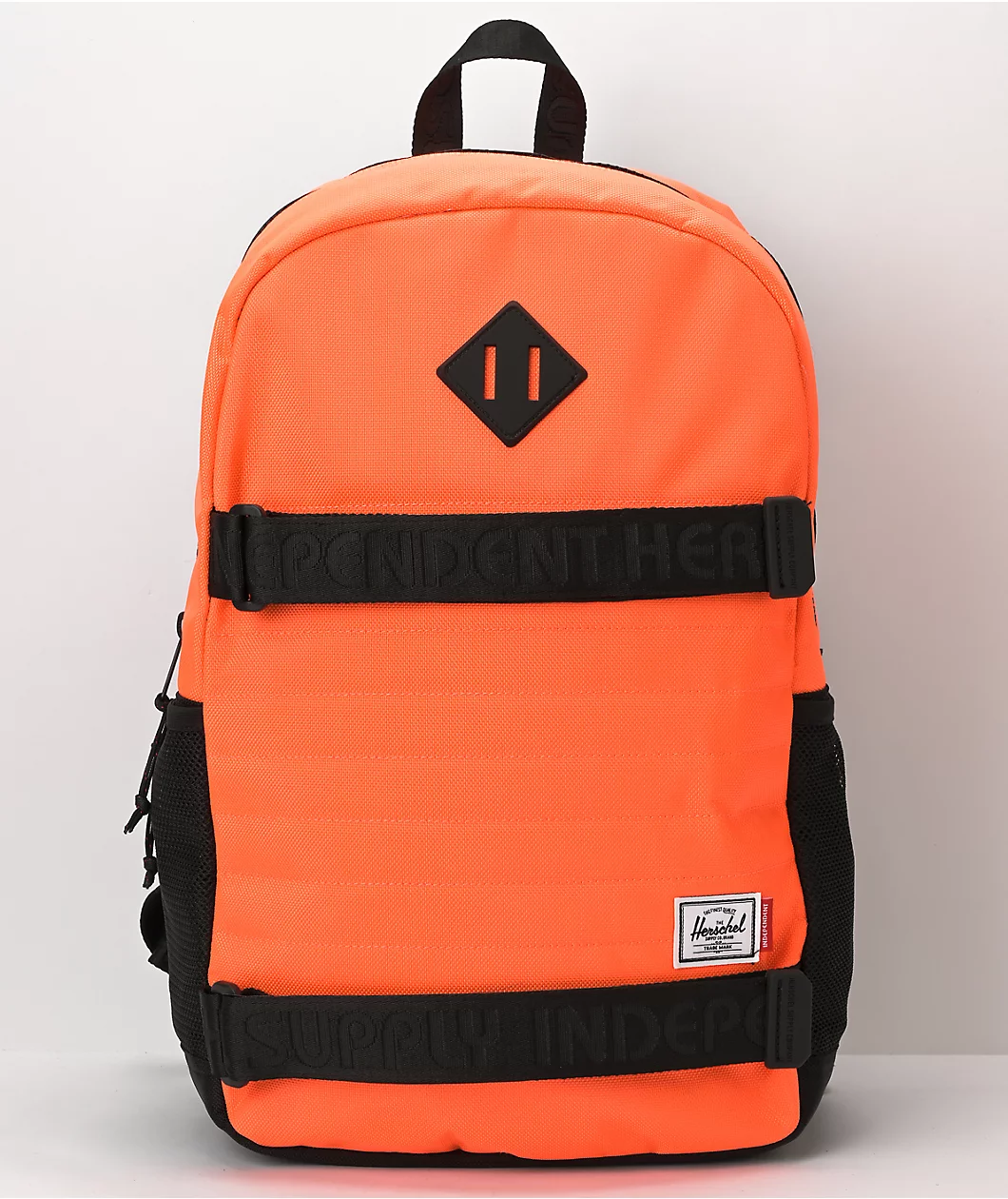 The Fleet backpack from Herschel Supply Co x Independent comes in a bright orange color with contrasting black accents for an accessory that is both stylish and functional. This bag features a large compartment accessible from the top with a 15″ laptop sleeve inside, and comes with Herschel’s signature red and white inner-lining and brand patch on the front.