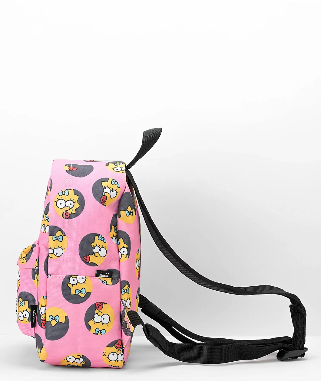 From the official Herschel x The Simpsons collaboration comes the Classic Maggie Simpson mini backpack in a pink colorway. Made from 100% recycled polyester, the bag features a sublimated grey polka dot print with Maggie making various expressions. The mini backpack’s main compartment has a custom cloud print lining reminiscent of The Simpsons intro, while a smaller zipper compartment can be seen on the front. With a top haul handle and adjustable shoulder straps, the bag is finished with a woven Herschel Supply Co. label on the front.